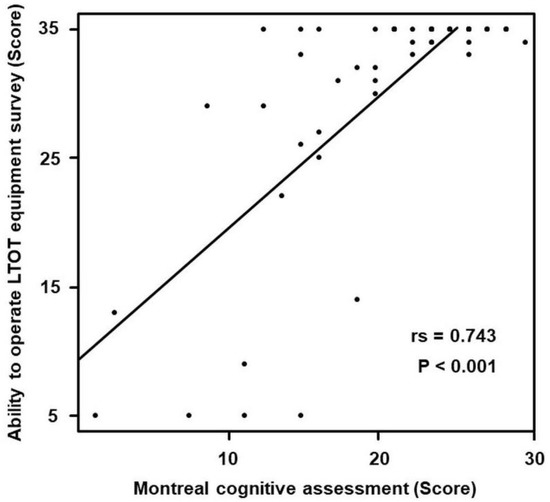 Correlation between the ability to operate long-term oxygen therapy (LTOT) equipment survey and Montreal Cognitive Assessment. The ability to operate LTOT equipment and cognitive function (rs = 0.743, p < 0.001) were positively correlated.