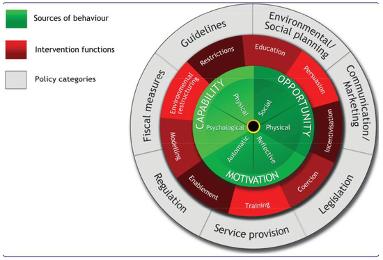 - Michie, S.; Atkins, L.; West, R. The Behavior Change Wheel: A Guide to Designing Interventions; Silver Back Publishing: Sutton, UK, 2014; ISBN 978-1-912141-00-5. [Google Scholar]