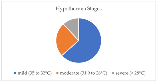 The stages of accidental hypothermia were defined as mild (core temperature between 35 and 32 °C), moderate (core temperature between 31.9 and 28 °C) or severe (core temperature below 28 °C) [1,2].
