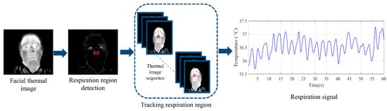 Respiration signal extraction procedure: First, the respiration region was extracted by cumulating temporal changes in the first few frames of the thermal sequence. Then, it was tracked in thermal image sequences, and finally, the signal was formed by calculating the mean temperature of the respiration region in each frame.
