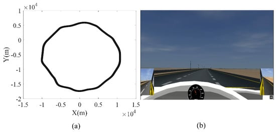 (a) Quasi-circular map of the three-lane highway with an average radius of 10 km; (b) graphical view of the road.