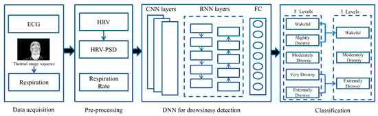 The pre-processed data obtained from the experiments were used to classify different levels of drowsiness using DNNs and classifiers were selected as a combination of CNN, RNN, and fully connected (FC) layers. Three input signals were considered for the classifiers: HRV, power spectral density of HRV (HRV-PSD), and the respiration rate (RR). The classification was conducted individually for two different outcome configurations: a 3-level classification and a 5-level classification. Classification levels were based on drowsiness levels in the ORD method. In the 3-level classification, ORD < 3 was considered as wakeful, ORD = 3 as moderately drowsy, and ORD > 3 as extremely drowsy. For the 5-level classification, all 5 levels of ORD scores were considered for the classification. The overall pipeline of the process is shown in Figure 5.