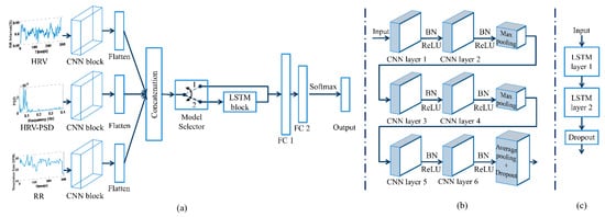 (a) The model architecture of the CNN and the hybrid CNN-RNN models. The model selector block is a hypothetical block to show the difference between the two models: state 1 shows the CNN model and state 2 shows the CNN-LSTM model; (b) details of the inner layers in the CNN blocks; (c) details of the LSTM block. CNN: convolutional neural network, HRV: heart rate variability, PSD: power spectral density, RR: respiration rate, LSTM: long short-term memory, FC: fully connected, BN: batch normalization, and ReLU: rectified linear unit.
