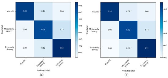 Figure 7 and Figure 8 show the normalized confusion matrices for the three-level and the five-level classifications using CNN and CNN-LSTM models with all signals used as an input. For three drowsiness levels, the sensitivities were 80% for wake, 76% for moderately drowsy, and 88% for extremely drowsy in the CNN model (Figure 7a). In the CNN-LSTM model, the sensitivities were 88% for wake, 82% for moderately drowsy, and 91% for extremely drowsy (Figure 7b). The sensitivities for five-level drowsiness detection were 65% for wake, 61% for slightly drowsy, 70% for moderately drowsy, 55% for very drowsy, and 60% for extremely drowsy in the CNN model (Figure 8a). In the CNN-LSTM model, the sensitivities were 68% for wake, 57% for slightly drowsy, 69% for moderately drowsy, 65% for very drowsy, and 74% for extremely drowsy (Figure 8b).