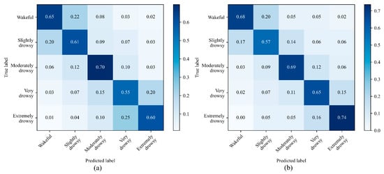 Normalized confusion matrices for 5-level drowsiness detection in the (a) CNN model and the (b) CNN-LSTM model.
