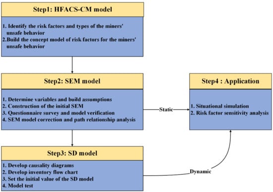 In 1956, United States Professor J. W. Forrester of the United States proposed SD (System Dynamics) to analyze production management, inventory management, and other enterprise management issues []. This mathematical modeling technique is used to understand and discuss complex problems and their changes over time. It has been widely applied in many fields, such as maritime affairs, engineering construction, education, and behavioral science [,,,]. SD has outstanding advantages in analyzing dynamic complex systems with internal feedback loops, and its application in miners’ unsafe behavior has been well developed and quite mature. This model can provide a way to analyze the dynamic relationship between the safety input and unsafe behavior levels of deep coal mines [,]. At the same time, the SD model is based on a feedback loop to study the problem, and the data dependence is not high. Most parameters in the model have little influence on the simulation system. The simulation system can run stably as long as there are loops in the model, and the relationship among the factors is reasonable. Therefore, using the SD model to evaluate miners’ unsafe behavior in the deep coal miner can overcome the problems of risk uncertainty of miners’ unsafe behavior and insufficient data on risk factors. However, it is challenging to identify the variables of the SD model and quantify the equations between the variables. To solve this problem, we introduced the HFACS-CM model, which can identify the risk factors of miners’ unsafe behavior in a deep coal mine, and SEM, which can explain the relationship between variables. The analysis results of these two models support the establishment of the SD model. Compared with the traditional multiple regression model, the combination of HFACS-CM and SEM can quickly identify the risk factors of unsafe behaviors of miners, test the internal structural relations between variables in the model, and visualize these relationships [,]. Although both HFACS-CM and SEM are static research methods, SD models can be established according to the correlation between the risk factors identified by HFACS-CM and the factors analyzed by SEM. Therefore, the SD model based on HFACS-CM and SEM was found to quantitatively predict the development trend of the unsafe behavior level of deep coal miners and the sensitivity of each risk factor to the unsafe behavior level of coal miners. As shown in Figure 1, this study was divided into four steps.