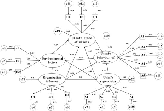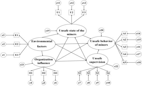 SEM is a statistical method used to analyze the relationship between variables through a covariance matrix. As an empirical analysis model, it can test the internal structural relationships between the variables in the model. This relationship was expressed as a causality model and path graph through factor, path, and covariance analyses []. The SEM includes potential and observational variables. Observation variables can be obtained through direct observation, whereas potential variables need to be obtained indirectly through observation variables []. Based on the improved HFACS-CM model, the subsystems that affect the level of miners’ unsafe behavior are classified into four subsystems: environmental factors subsystem, organizational influence subsystem, unsafe supervision subsystem, and miners’ unsafe state subsystem. Therefore, the environmental factors subsystem, organizational influence subsystem, unsafe supervision subsystem, miners’ unsafe state subsystem, and miners’ unsafe behavior subsystem are considered latent variables in the structural equation model. Among them, the observed variables of the environmental factor subsystem include the physical environment, technical environment, and policy environment. The observed variables of the organizational influence subsystem include resource management, organizational climate, and organizational processes. The observed variables of the unsafe supervision subsystem include improper operation plan, failure to correct a problem, and violation supervision; the observed variables of the miners’ unsafe state subsystem include mental state, physiological state, and business ability. The observed variables of the miners’ unsafe behavior subsystem include decision errors, skill-based errors, perceptual errors, routine violations, and exceptional violations, as shown in Table 1.