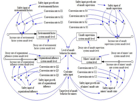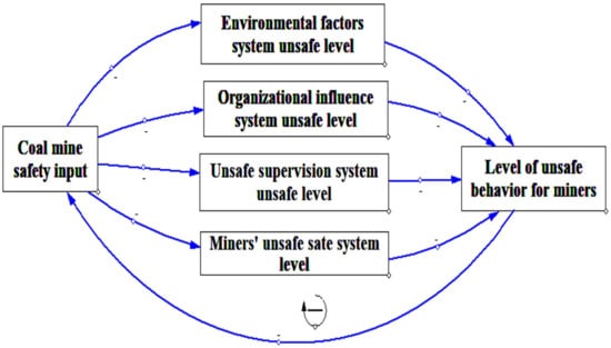 A causal cycle diagram is composed of one or more feedback cycles, which reflect the relationship between the inputs and outputs of various factors in the system, and the relationship between the external environment and the inputs and outputs of the system []. The coal mine safety input is an important guarantee for reducing the unsafe behavior level of deep coal miners. If miners’ unsafe behaviors are high, input in coal mine safety should be increased to improve the factors affecting miners’ unsafe behaviors. In contrast, if the level of unsafe behavior of miners is low, input in safety can be appropriately slowed down. From the perspective of the input and output of coal mine safety, this study analyzes the internal causal relationship and evolution process among the risk factors of unsafe behavior in deep coal miners. Based on the SEM constructed above, the deep coal mine safety input was introduced to establish the causal cycle of the safety management process, reflecting the unsafe behaviors of deep coal miners, as shown in Figure 5. As seen in Figure 5, increasing the input in coal mine safety can reduce the unsafe level of the environmental factors, organizational influence, unsafe supervision, and miner’s unsafe state subsystems, thus reducing the level of miners’ unsafe behavior. When the unsafe behavior of miners reaches the target level, the system can reduce the input of coal mine safety and avoid wasting resources through feedback on the level of unsafe behavior. In this system, coal mine safety input refers to the measures taken by coal mine enterprises to reduce unsafe behaviors. The system’s output relates to a reduction in the occurrence of unsafe behaviors.