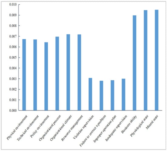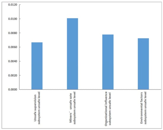 Given the above analysis, this study only conducted a simulation analysis on the direct influence of environmental factors, organizational influence, unsafe supervision, and the unsafe state of miners on miners’ unsafe behavior. The obtained normalized path coefficients of SEM were converted into normalized weights of latent and observed variables, as shown in Table 8. This can be seen from Table 8 that the unsafe state of miners has the most significant weight, followed by organizational influence, environmental factors, and unsafe supervision.