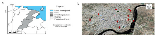 Location of the district of Ilave in the province of El Collao (a) and location of the ten sampling points (b), located in the city of Ilave, Region of Puno, Peru.