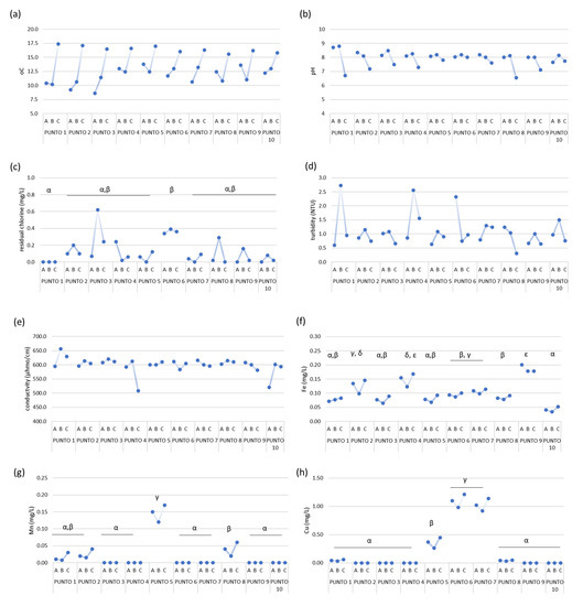 Determination of physical-chemical parameters for the 10 sampling points and three sampling dates: (a) temperature, (b) pH, (c) chlorine concentration, (d) turbidity, (e) conductivity, and the heavy metals concentration of (f) Fe, (g) Mn, and (h) Cu. Zn was not detected in the samples and Ni was only detected in samples A from Punto 2 and 3, at 0.001 and 0.003 mg/L, respectively. When observed, significant differences (p < 0.05) between samples are indicated by the letters α, β, γ, ε, and δ.