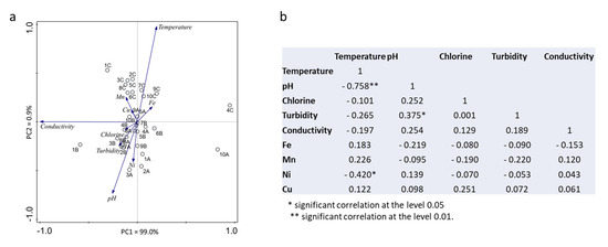 Nine household taps and a river, used as the source for drinking water production, were sampled. All the drinking water samples fulfilled the quality criteria for human consumption in terms of the physical-chemical parameters determined [25]. However, some variances were observed between the three sampling days, with the most notorious being a significant increase (p < 0.05) in the temperature from the first and second (A and B) to the third sampling date (C) (Figure 2). As expected, a negative correlation (r = −0.758, p < 0.01) was observed between the temperature increase and the pH values (Figure 3b), which tendentially decreased in sampling C. The same negative correlation was observed in the principal components analysis (Figure 3a).