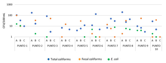 For the microbiological analysis, the portable MEL Total Coliform and E. coli Laboratory equipment (HACH Company, Loveland, CO, USA) was used. All the containers were previously sterilized and the ones to be used to collect treated water (PUNTO 2–PUNTO 10) were prepared with 10 mg of sodium thiosulfate per 100 mL of sample, to neutralize the chlorine. Volumes of 100 mL of water sample were used. The m-ColiBlue 24 broth (M00PMCB24, (HACH Company, Loveland, USA) was used to detect and quantify total coliforms and E. coli after 24 h of incubation at 35 °C and 44.5 °C, respectively. The m-FC, without rosolic acid, broth (MHA00FCR2, Millipore, MA, USA) was used for the detection and quantification of fecal coliforms after 24 h of incubation at 44.5 °C.