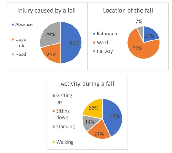 Falls in older adults are considered one of the geriatric syndromes because of their high prevalence, multiple causes, reoccurrence, and serious consequences. The majority of hospital falls observed in our study occurred while getting up (43%) or walking (22%) in a patient’s room (71%) or bathroom (21%). Half of them resulted in an injury requiring medical intervention, and the hospital length of stay of patients that experienced in-hospital falls was significantly longer. Struble-Fitzsimmons described the location and activity of patients related to falls in the department of geriatric psychiatry. Most of the 61 falls, 67.8%, occurred in the patient’s room (44.1%), the bathroom (23.7%), and the corridor (18.6%). The most common activities of the patients during the fall were walking (49.1%) and shifting (36.8%, n = 21). More than half (57.1%) of all transfer-related falls occurred while getting out of bed []. Draper et al., who researched 55 people who fell in hospital, found that the most common location of falls was the patient’s room, and the second most common location was the ward, followed by the bathroom and the corridor []. These results largely reflect the data from our department.