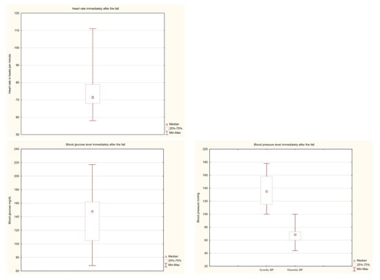 Most falls occurred in patients’ rooms (Figure 1) and less often in the bathroom and hallway. The activity during which these incidents occurred most often was getting up from bed. Half of the accidents resulted in injury to the body (most often the head or upper limbs). The scatter of values for blood sugar, blood pressure, and heart rate, which were assessed just after the fall, was rather large (Figure 2).