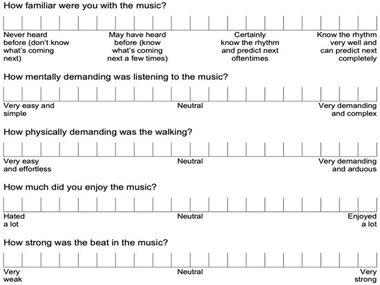 Before the gait trials, participants completed Barcelona Music Reward Questionnaire (BMRQ, 20 items), a self-report measure of individual differences in music reward (i.e., how people experience reward in music-related activities) [29]. Based on the scoring algorithm, BMRQ scores were further processed into five factors (i.e., music seeking, emotion evocation, mood regulation, sensory-motor, and social reward) [29]. After each walking trial, participants indicated their perceived familiarity, enjoyment, cognitive demand, physical demand, and beats salience using 20-point visual analog scales (VAS). See Figure 1 for an overview of the scales used.