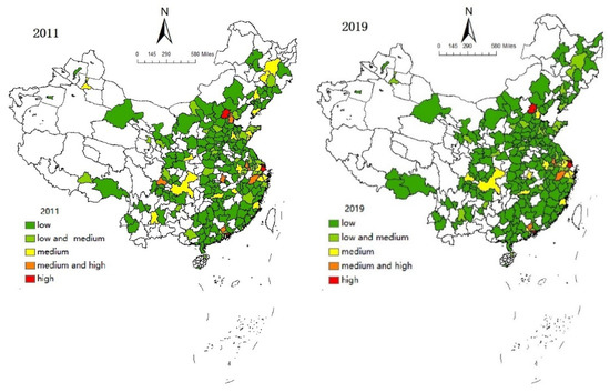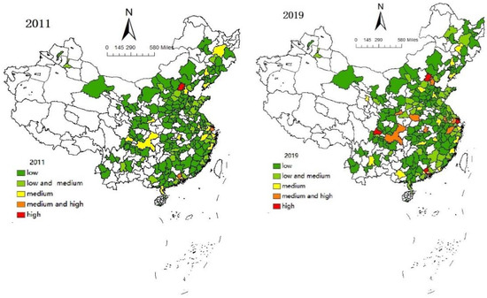 Figure 1 shows the visual analysis of the digital transformation index of China’s agricultural enterprises in 2011 and 2019. The results show that although the development of digital agriculture in China has improved somewhat in recent years, the overall level of digital agriculture is still not high, and only a few developed large and medium-sized cities develop rapidly. Therefore, the task of accelerating agricultural digital transformation and seeking to improve agricultural productivity is imminent.