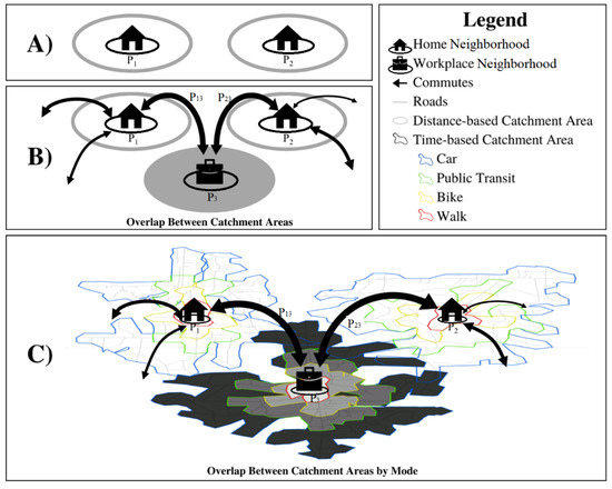 Figure 1. An illustration and comparison of food catchment areas defined by (A) the traditional mRFEI assuming people access food only from homes, (B) MO_RFEI with people accessing food from both home and workplace due to commuting, and (C) eRFEI with people accessing food from multiple origins and travel modes. Shaded areas show where the catchment areas of two populations overlap. Colored borders delineate catchment areas of different travel models.