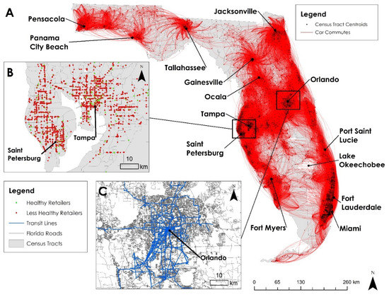 Figure 2. (A) Commuting flows by car between census tracts derived from the CTPP data. The line width is proportional to the number of commuters. For clarity, commuting trips were filtered if longer than 161 km (100 miles). (B) Healthy and less healthy food retailer locations in the Tampa Bay area. (C) Road network and transit lines in Orlando.
