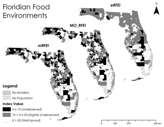 Locating underserved neighborhoods is one of the most important usages of food environment indices. Relevant to this study, we selected ten as the cut off value for “underserved” food environments or neighborhoods, which was the national average of mRFEI estimated by the CDC [11]. We also used a value range between 10 and 20 to define “slightly underserved” food environments. Census tracts with a score above 20 were considered “well served” (Figure 3). As shown in Table 1, the mRFEI identified the greatest number of underserved neighborhoods, followed by the MO_RFEI, while the eRFEI identified the fewest. This reduction represents a change in underserved population of nearly 3.09 million people, or 15.7% of the total population of Florida. In the slightly underserved category, the results followed an opposite trend, in which the mRFEI indicated the fewest number of tracts, followed by the MO_RFEI, while the eRFEI indicated the most. Many census tracts that were classified as “underserved” by the mRFEI and MO_RFEI were moved into the “slightly underserved” category when transitioning to the eRFEI. The observed trends in both categories can be attributed again to the incorporation of multiple origins and multiple travel modes, which pulled the food environment scores toward the centrality (around 20), as discussed above. These results highlight how commuting data continue to be paramount in replicating real world travel behaviors.