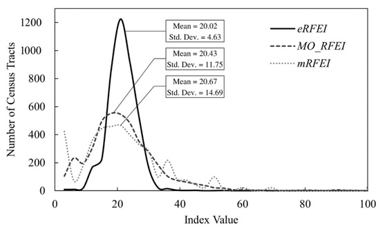 Figure 4 compares the centrality and variability of the three indices across Florida. From the mRFEI, to MO_RFEI, and to eRFEI, the results indicate a slow decrease in the mean value, but a dramatic drop in the standard deviation.