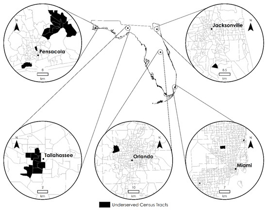 Figure 6. Underserved census tracts in urban areas according to the eRFEI. There are ten census tracts in Pensacola, eight in Tallahassee, one in Jacksonville, one in Orlando, and three Miami.
