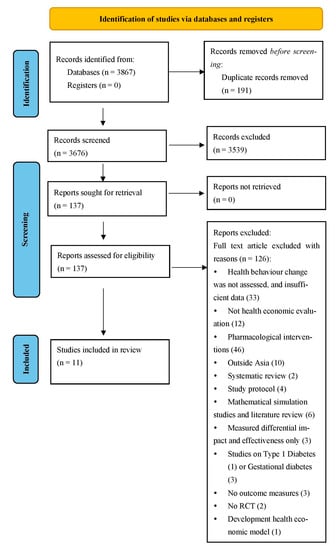 Dahal, P.K.; Rawal, L.B.; Mahumud, R.A.; Paudel, G.; Sugishita, T.; Vandelanotte, C. Economic Evaluation of Health Behavior Interventions to Prevent and Manage Type 2 Diabetes Mellitus in Asia: A Systematic Review of Randomized Controlled Trials. Int. J. Environ. Res. Public Health 2022, 19, 10799. https://doi.org/10.3390/ijerph191710799