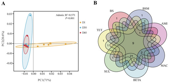 Through the comparison with observed OUT, Chao1 index, Shannon index, and PD_Whole_tree index (Figure S2) of BS, we found after dairy manure application, the bacteria alpha diversity was significantly decreased on the first incubation day (p < 0.05), and increased subsequently. However, compared with BSM, the antibiotic application did not change the alpha diversity substantially (p > 0.05). The bacteria beta diversity was analyzed using PCoA, the first two principal coordinates totally explained 95.0% of the bacterial variation (Figure 4B). Manure-contained samples were distributed independently from BS, and the samples of day 1 are separate from day 30 and day 60. PERMANOVA test showed incubation duration had a stronger impact on the bacterial structure (Adonis test, R2 = 0.56, p < 0.001) than different treatments (Adonis test, R2 = 0.23, p > 0.05).