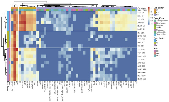 The heatmap shows the ARG profile of the individual sample, which was clustered according to the ARG distribution (Figure 3). From row clusters, we could see that cluster 1 covered all manure-contained samples of day 1, which possess the most ARG richness and abundance; BETA and TET of day 60 clustered together with three BS soils in cluster 2, showing their profiles were regressed and close to the background value of untreated soil; the third cluster could be considered to show that the effect of manure and antibiotic still continues. Individual genes in the column were also divided into three clusters: cluster 1 including intl-1(clinic), mexF, and sul2, these genes were the most abundant and almost existed in all samples; cluster 2 contained 7 genes that mainly convey resistance to aminoglycoside and tetracycline, the abundance of these genes increased after manure application and were persistent at a relatively high level throughout the experiment; cluster 3 contained 41 lower abundant or less detectable genes, most of their abundance decreased by a large margin or dissipated over time.