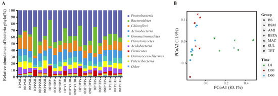 Bacterial abundance and diversity of different samples. (A) Relative abundance of major bacteria at the level of phylum. (B) PCoA plot of bacteria among different soil samples on day 1, 30, and 60.