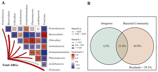 Drivers of the ARG profiles in the soil. (A) Mantel test between the entire ARG profiles and dominant bacterial community (>2% percentage). *, **, *** represent Spearman’s p < 0.05, p ≤ 0.01, p ≤ 0.001, respectively. (B) VPA chart showing the effects of bacterial community and integrons on the shifts of soil resistomes.