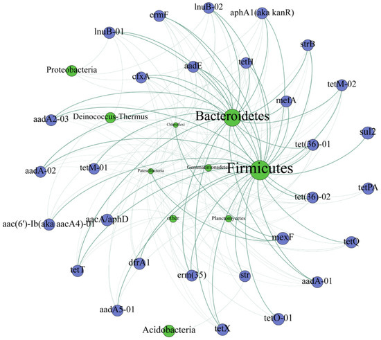 Network analysis between individual ARGs and bacteria community. The green and blue nodes represent the bacteria phyla and ARG subtype, respectively. A connection represents a strong correlation (Spearman’s correlation coefficient ρ ≥ 0.7 and significance level p < 0.01). The size of a node is proportional to the weighted degree, that is, the sum of the correlation coefficient of all connections related to this node.