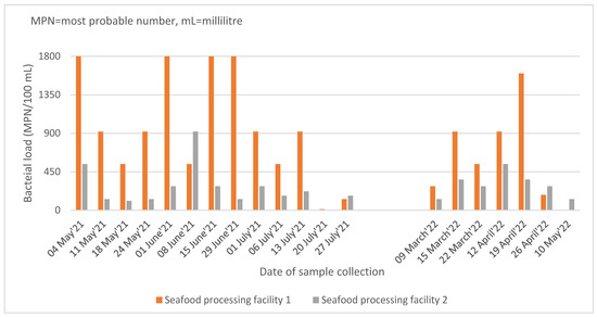 The EPA, as part of the surveillance system, collected a total of 38 weekly effluent samples (19 from each seafood processing facility) in 2021 and 2022, as shown in Table 1. Sample collection and analysis were completed using the most probable number (MPN) method, according to the procedures outlined in the Standard Methods for the Examination of Water and Wastewater, 2012 [13]. Effluent grab samples were collected at the final effluent discharge points of each of the two seafood processing facilities. Grab samples are a small representative subset of a larger quantity, taken at a specific time.
