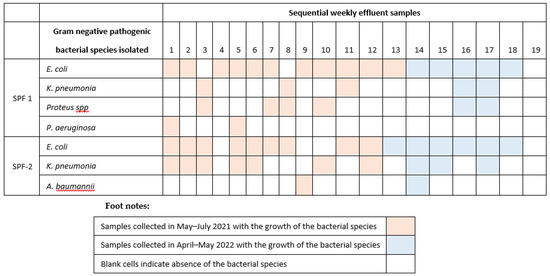 Other bacterial species, such as Salmonella spp., and Shigella spp. organisms, that were also of significance under surveillance, were not isolated from these effluent samples. The effluent samples in which the bacteria of surveillance significance were isolated are given in Figure 2. In almost all samples E. coli was identified. K. pneumoniae was isolated predominantly in the samples from seafood processing facility 2 (SPF-2) and in the initial samples collected. P. mirabillis and P. aeruginosa were isolated from the effluent samples of seafood processing facility 1 (SPF-1) and A. baumannii in seafood processing facility 2 (SPF-2).