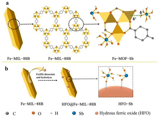 - Iron−based materials are highly efficient adsorption materials. Iron is thought to be the most effective metal at repairing antimony adsorption sites. It also appears to have some influence over arsenic adsorption. Additionally, it is simple to recycle and convert it into HFO, which can successfully encourage the adsorption of antimony and arsenic by the adsorbent. In particular, antimony has an adsorption impact that is many times greater than that of ordinary materials. Furthermore, iron−based MOFs can more effectively adsorb heavy metals in solution and use the coordination of coordination bonds with the formed HFO to accelerate the adsorption of antimony and arsenic in water. The materials are easier to recycle and reuse, thereby reducing costs and by−products. As a result, using iron−based materials to adsorb antimony and arsenic can significantly increase their adsorption capacity, making this a useful adsorption technique.