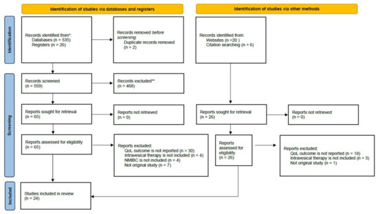 The process of literature screening and selection presented using the PRISMA 2020 flow diagram. * PubMed and the Cochrane library database; ** Studies did not involve NMIBC patients, did not include quality-of-life as outcome measures, and non-English publications.