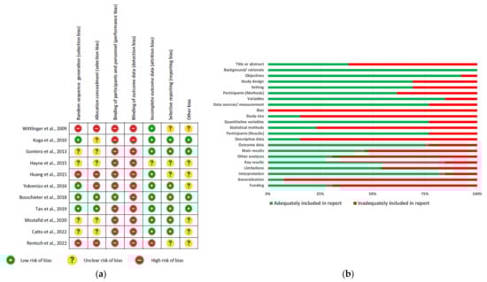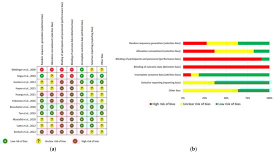 Overall quality of the interventions included in this systematic review was poor because the majority of these studies carried high or unclear risk of bias in at least half of the 7 evaluated components (Figure 2a). The risk for performance bias (91%) and detection bias (100%) were exceptionally high due to lacking evidence of blinding procedures (Figure 2a,b). Blinding of patients but not the outcome data was performed in the study of Bosschieter et al. [51] while Tan et al., 2019 [52] fulfilled all remaining components except blinding. The performance regarding selection bias was moderately poor, because 7 and 9 trials were rated high or unclear risk for random sequence generation and allocation concealment, respectively, including the 2 single-arm interventions [42,58] in which such procedures are completely lacked by default (Figure 2a). Risk of attrition bias by analyzing incomplete outcome data was rated as low in 82% (Figure 2a,b). In contrast, approximately one-third (36%) of the included studies carried unclear risk of reporting bias due to selective reporting of outcome results for further analysis (Figure 2a,b). However, other unclear forms of bias were identified in most of the included interventions (Figure 2a,b).
