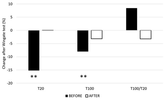 The mean T20 measured before the 15 s Wingate test did not change in a statistically significant fashion after training (from 19.14 ± 7.6 Nm to 16.46 ± 7.66 Nm, p > 0.05) (Figure 1). The changes in T20 after the Wingate test were statistically significant before training (mean T20 decreased by 3.11 Nm, p < 0.01) but not after training (mean T20 increased by 0.29 Nm, p > 0.05). The mean T100 measured before the 15 s Wingate test did not change statistically significantly after training (from 31.00 ± 13.22 Nm to 29.54 ± 14.30 Nm, p > 0.05). The changes in T100 after the Wingate test were statistically significant before training (mean T100 decreased by 2.49 Nm, p < 0.01) but not after training (mean T100 decreased by 0.93 Nm, p > 0.05). The mean T100/T20 ratio changed by 11.78%, from 1.08 before training to 0.96 after training.