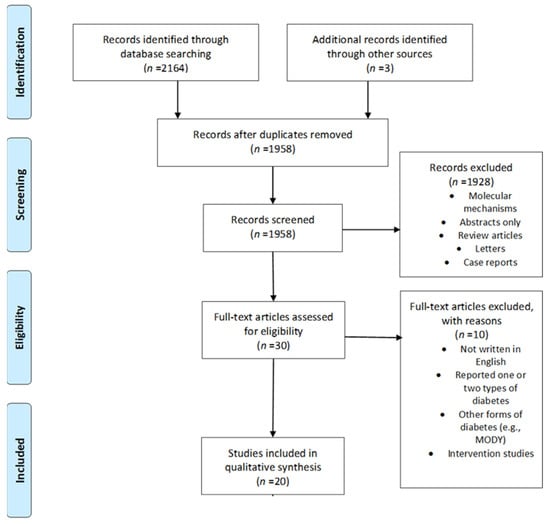A total of 2164 studies were identified from the search strategy. An additional three articles were identified by reviewing the reference lists of relevant articles and reviews resulting in 2167 articles. After removing duplicates, 1958 article titles and abstracts were screened for eligible full-text articles. We excluded studies that compared one or two types of maternal diabetes only, interventional studies, those not written in English, review articles, letters, case reports and abstracts. A total of 20 studies, published between January 1993 and December 2021, met the inclusion criteria and are discussed in this review (Figure 1).