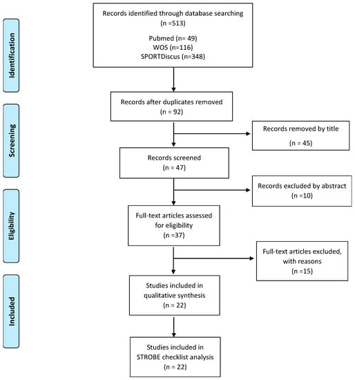 Figure 1 details all the steps of the process followed according to the recommendations of the PRISMA flowchart in the studies selection. We identified a total of twenty-two studies [,,,,,,,,,,,,,,,,,,,,,] published between 2003 and 2021 that presented data on the association between adolescents’ commute mode to school and overweight/obesity which were included in the systematic review from the original 513 articles identified by the literature search. The most common reason for excluding studies was that they did not meet the inclusion criteria, mainly by age.