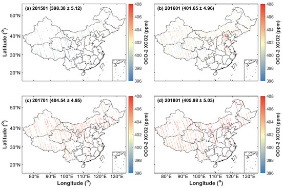 Average monthly data of OCO-2 XCO L2 Lite_FP in China: (a) January 2015, (b) January 2016, (c) January 2017, and (d) January 2018.