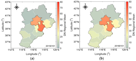 Regional mean value results of VIIRS S-NPP luminous data. The left and right figures show the regional mean value results of luminous data on (a) 1 January 2015 and (b) 1 January 2016, respectively.