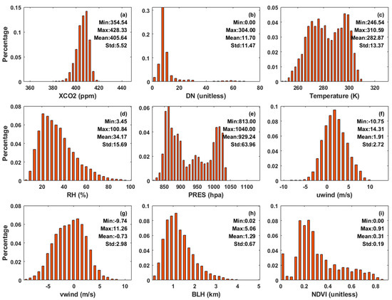 The frequency histogram of parameters in XCO2 concentration modeling (n = 62,964). (a–i) represent CO2 column concentration, digital number, temperature, relative humidity, pressure, vertical wind speed, horizontal wind speed, boundary layer height, and normalized vegetation index, respectively.
