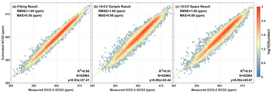 By establishing random forest model for the XCO2 reconstruction by integrating multisource remote sensing data, the model accuracy statistics were computed, including the direct fitting results of the training model, the cross-validation results based on samples, and the spatial cross-validation results based on spatial locations (Figure 6). The longitude and latitude information of each group of data were recorded. During the spatial cross-validation, all matched data were randomly divided into ten equal parts according to longitude and latitude.