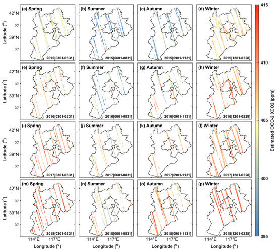 To better reflect the overall change in XCO2 concentration in the Beijing–Tianjin–Hebei region, the proposed model was used to estimate and map the XCO2 concentration in the whole region from 1 January 2015 to 31 December 2019. First of all, this study used the original OCO-2 satellite observation data to map the seasonal mean values of XCO2 concentration in Beijing, Tianjin, and Hebei. Since the winter data in 2019 are only in December, only the seasonal mean value results of OCO-2 XCO2 concentration in spring, summer, autumn, and winter from 2015 to 2018 are plotted (Figure 7).