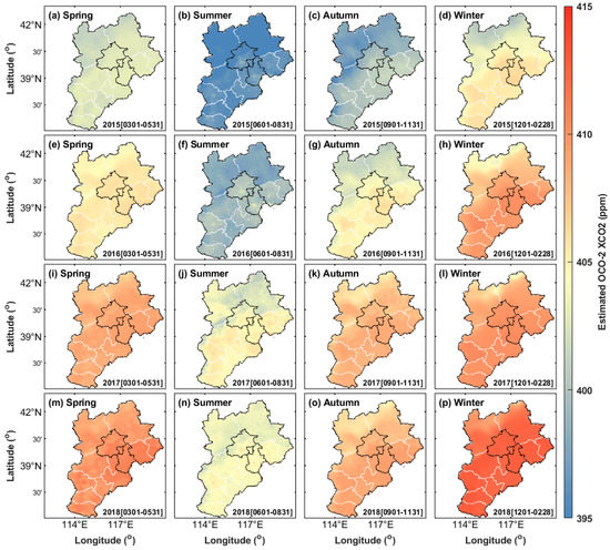 Seasonal XCO2 in the Beijing–Tianjin–Hebei region estimated by the random forest model from March 1, 2015 to February 28, 2019: (a–d) 2015, (e–h) 2016, (i–l) 2017, and (m–p) 2018 in spring, summer, autumn, and winter, respectively.