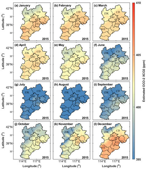 Monthly average XCO2 concentrations in the Beijing–Tianjin–Hebei region from January 2015 to December 2015. ZJK, CD, BJ, TJ, TS, and SJZ represent Zhangjiakou, Chengde, Beijing, Tianjin, Tangshan, and Shijiazhuang, respectively. (a–l) represent January to December respectively.