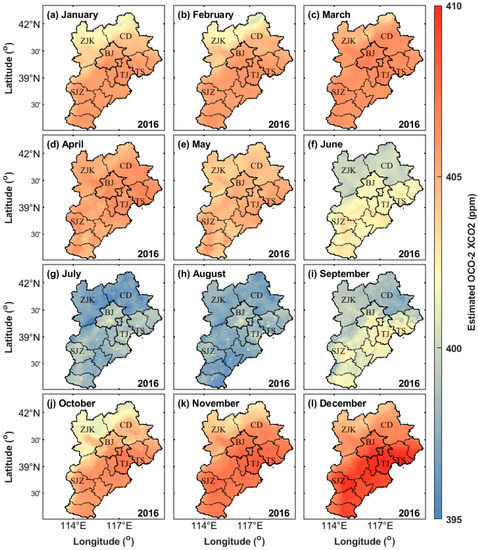 Monthly average XCO2 concentrations in the Beijing–Tianjin–Hebei region from January 2016 to December 2016. ZJK, CD, BJ, TJ, TS, and SJZ represent Zhangjiakou, Chengde, Beijing, Tianjin, Tangshan, and Shijiazhuang, respectively. (a–l) represent January to December respectively.