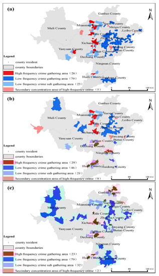 - The property crime, violent crime, and special crime in Liangshan Prefecture exhibited obvious spatial differences. Towns within the central region area were typical high-frequency crime gathering areas, with higher numbers of violent crime, property crime, and special crime. Obviously, in the western region, only special crime shows low frequency gathering areas. The situation in the eastern region was more complicated. Specifically, the high frequency gathering areas of property crime, violent crime, and special crime was alternately distributed here.