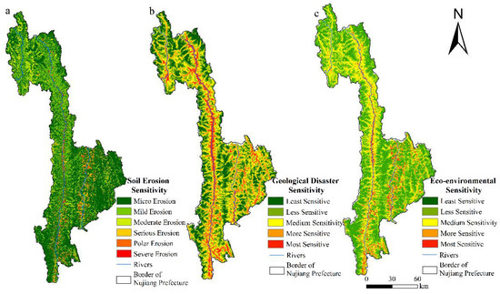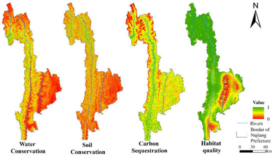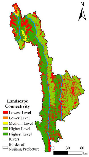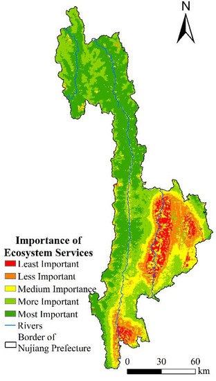 - The importance of ecosystem services was higher in the west and lower in the east. The ecological environment of Nujiang is characterized by a small number of more and most sensitive areas which are distributed in discontinuous bands along both sides of Nujiang river and Lantsang River, and the high-sensitive areas of the ecological environment were distributed discontinuously along the banks of the Nujiang and the Lantsang River. The areas with high landscape connectivity were distributed in patches in the Gaoligong Mountain Nature Reserve and the Biluo Snow Mountain, and the areas with high landscape connectivity were primarily distributed in the high-altitude ice-covered land of Gongshan County and densely populated areas along the banks of Nujiang River and Lantsang River.
